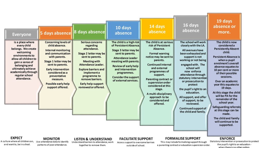 The school has a fully embedded ethos in which excellent school attendance is expected, developed and nurtured. The escalated approach to supporting attendance is built on foundations of belonging and connectedness.