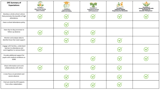 The table below identifies how the 5 Foundations of Effective Attendance Practice will underpin the DFE 2022 paper in meeting the summary of expectations.